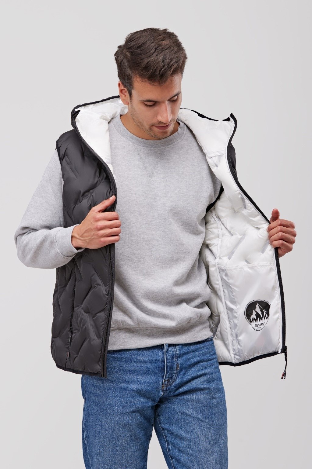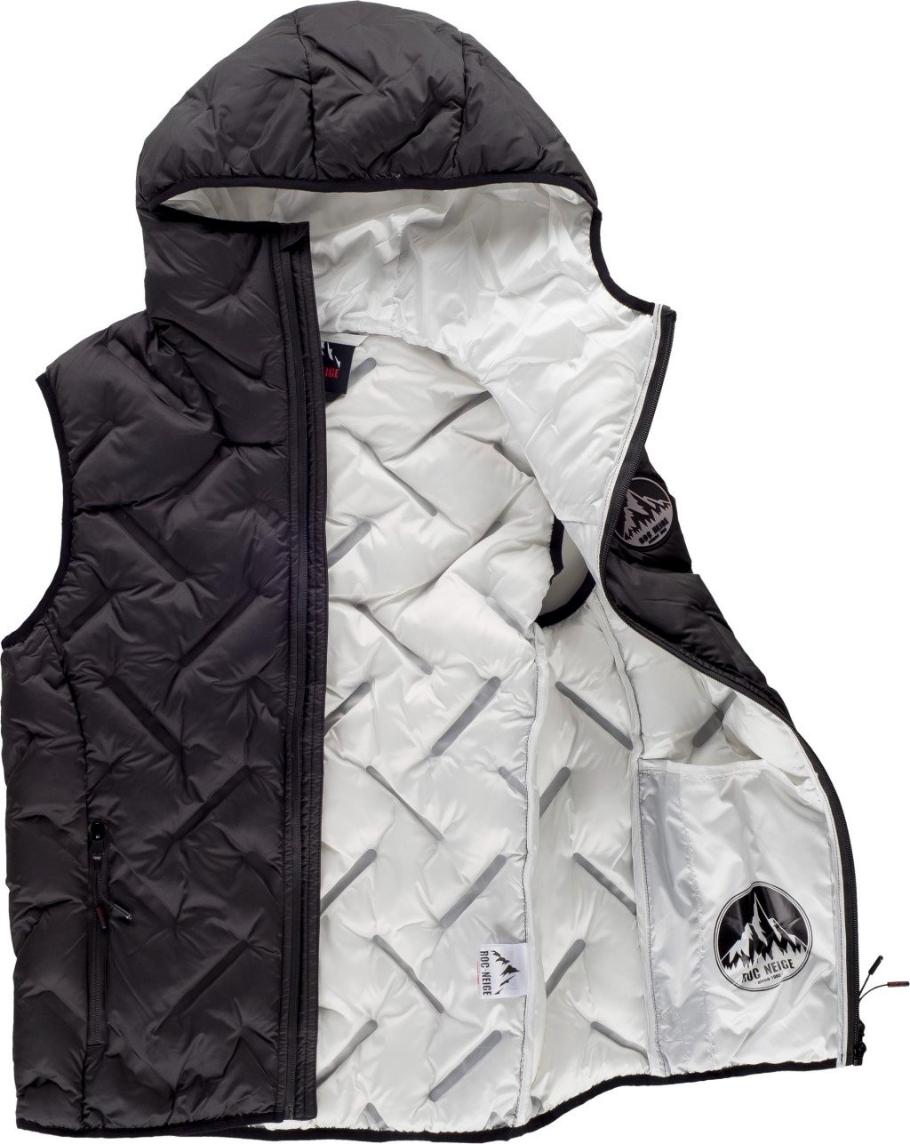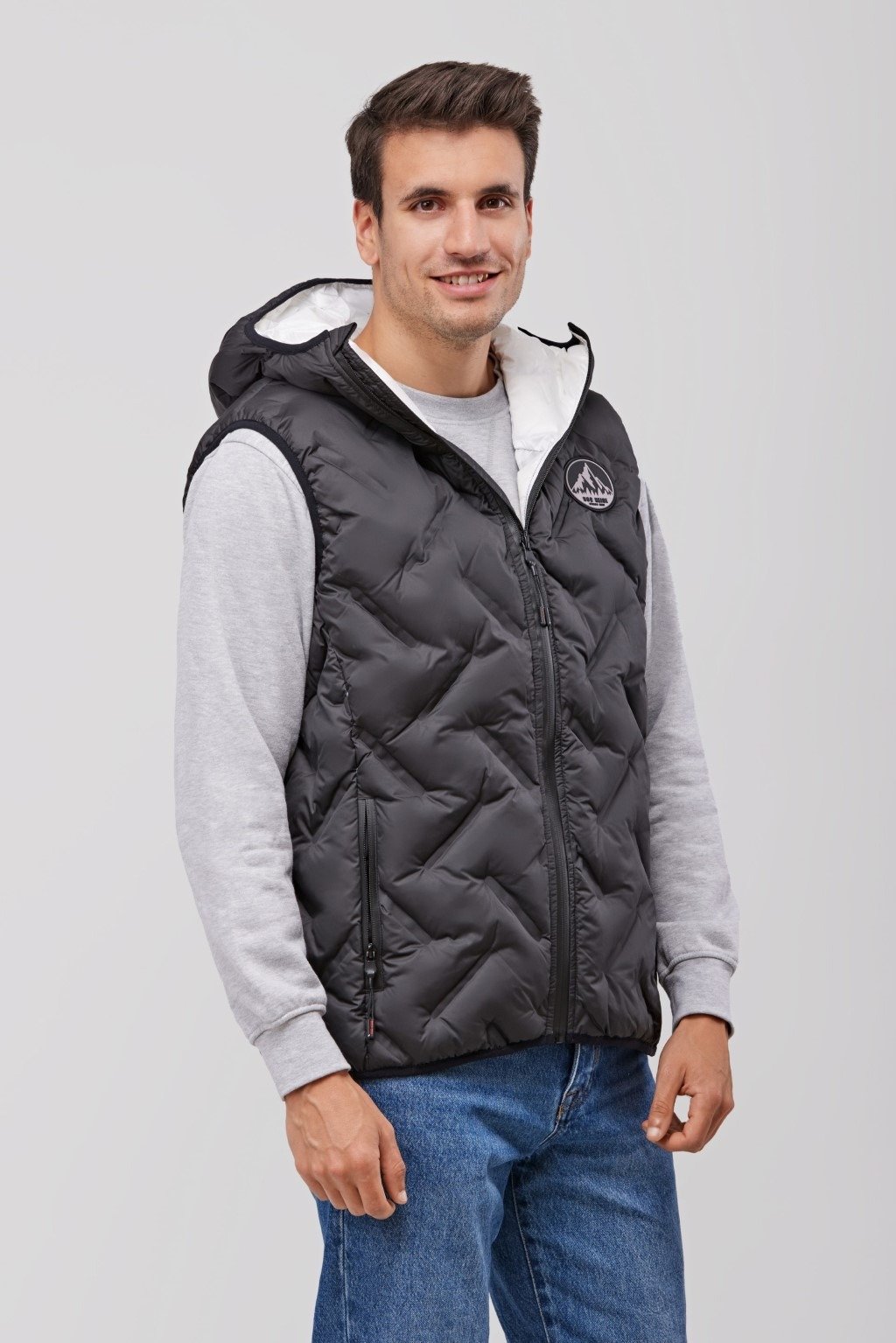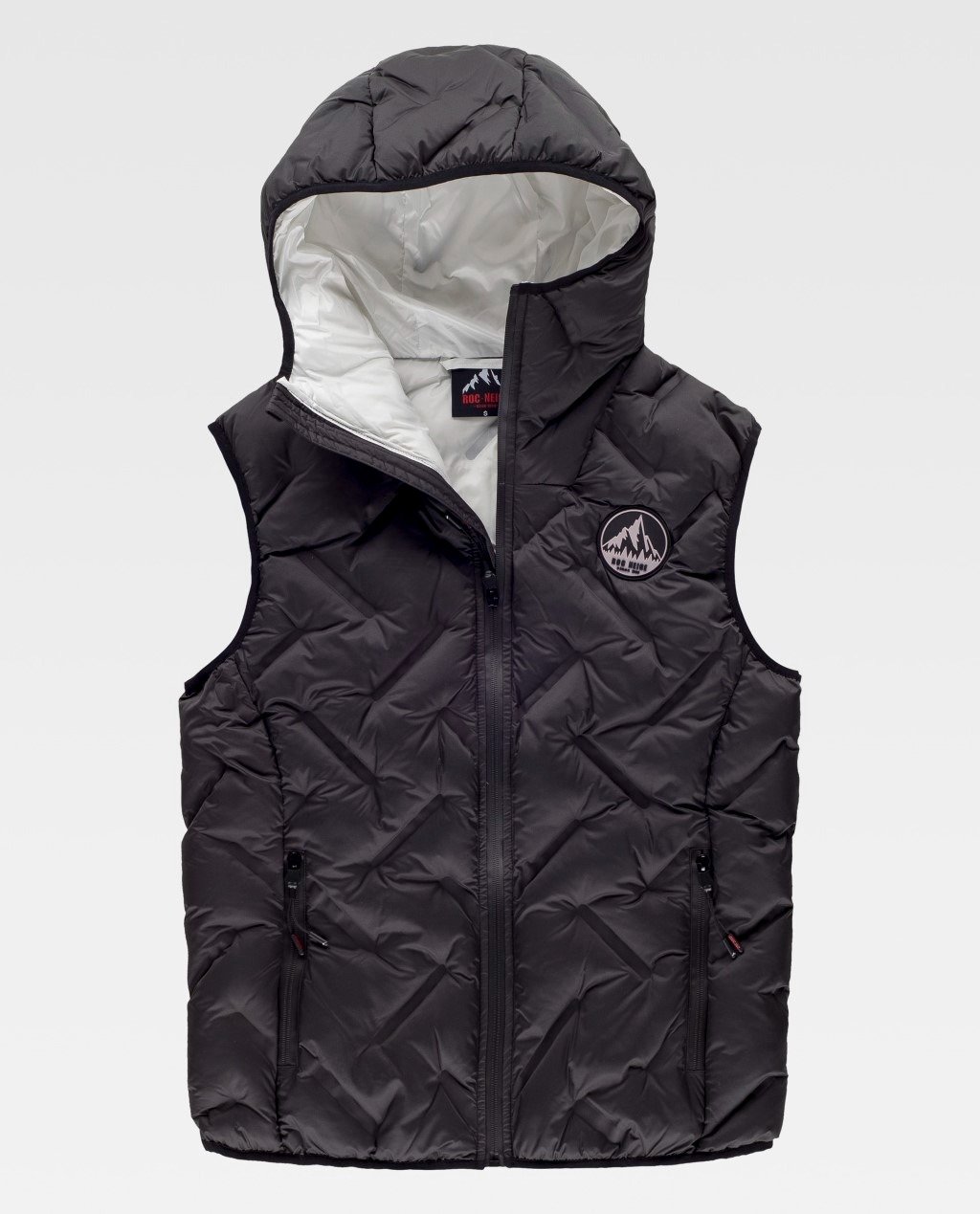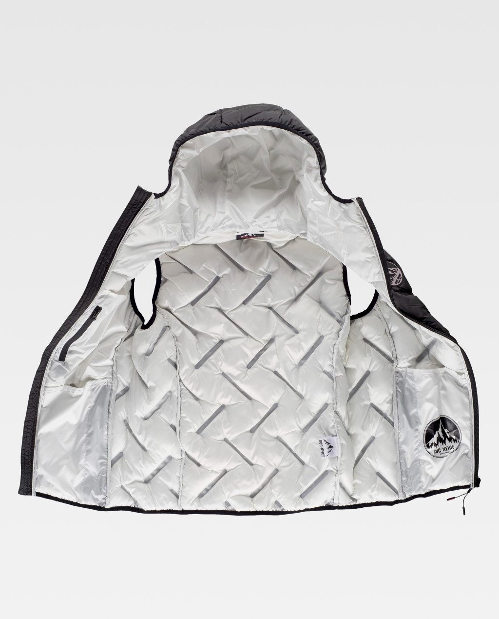 Chaleco FÖLD acolchado sellado de capucha y cuello alto con un original patrón de sellado que aporta estilo al confort de su corte. Costuras selladas. Tratamiento de repelencia al agua y cremalleras impermeables. Cierre de cremallera y protector de barbilla.