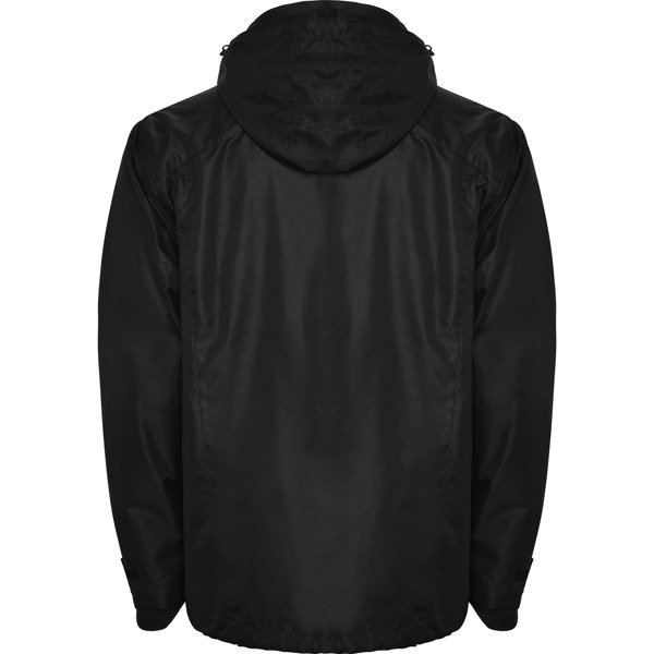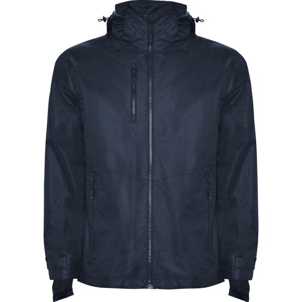 Chaqueta impermeable en tejido cuadrillé con forro interior. Cuello alto y capucha extraíble con ajustadores. Cremallera frontal inyectada y protector de barbilla. Un bolsillo en el pecho y dos laterales con cremallera. Puños con abertura para pulgar y ajustador de velcro. Dos bolsillos interiores con velcro. Ajustadores en interior del bajo.