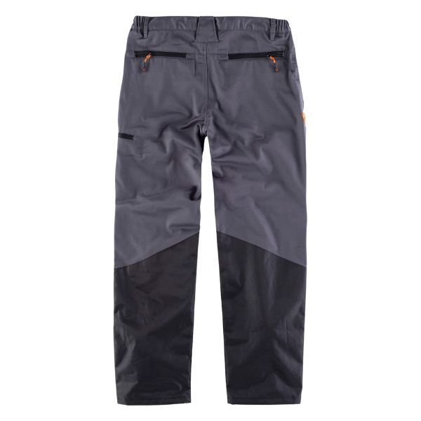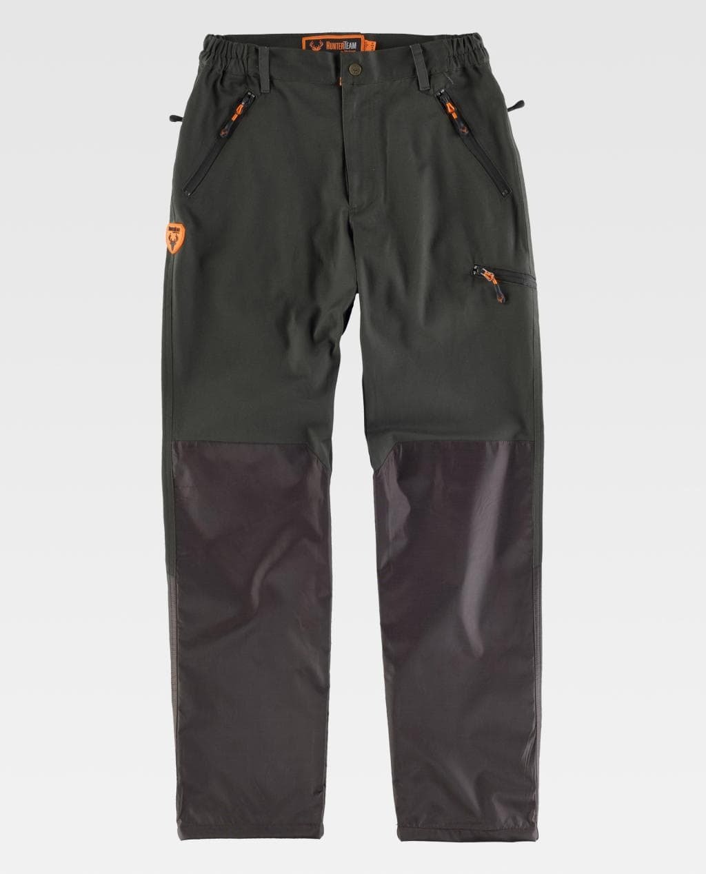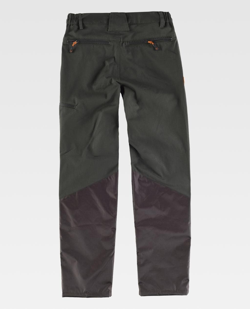Pantalón recto combinado. Dos bolsos de abertura inclinada en los costados, un bolso lateral y dos traseros, todos interiores con cremallera de cierre invertido. Refuerzos en las rodillas con tejidos combinados. Elástico en los laterales de la cintura y cubrecosturas interior. Trabillas de diferentes tamaños. Cierre de corchete metálico y bragueta de cremallera metálica.