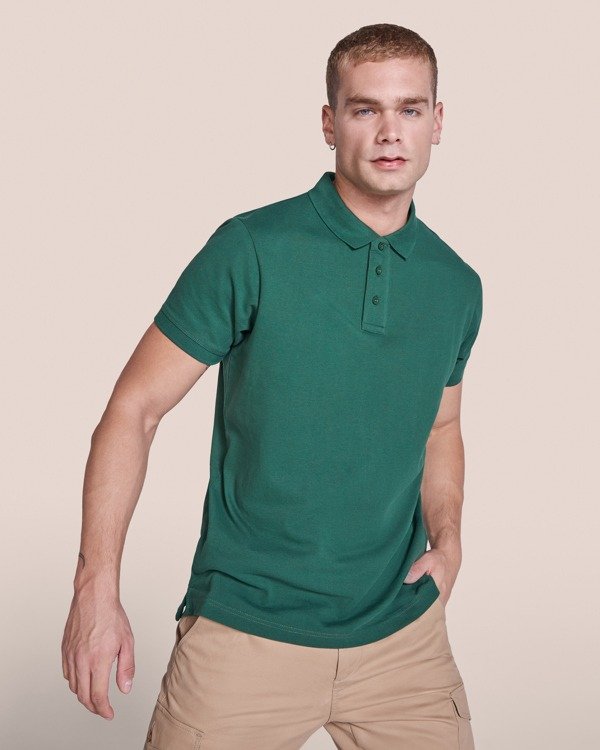 Polo de hombre con manga corta de alta calidad, en tejido confortable. Cuello con tapeta de tres botones a tono con el tejido. Solapa y ribete de la manga acanalado. Cubrecostura de refuerzo en el interior del cuello. Aperturas laterales con cubrecosturas a tono. El patronaje de la espalda es ligeramente más largo que el delantero. Doble costura en hombros, mangas y bajo de la prenda.