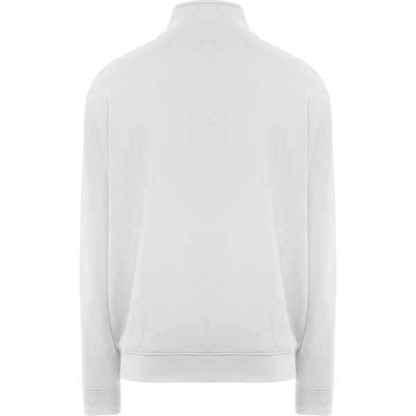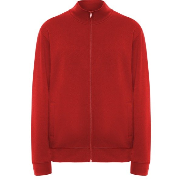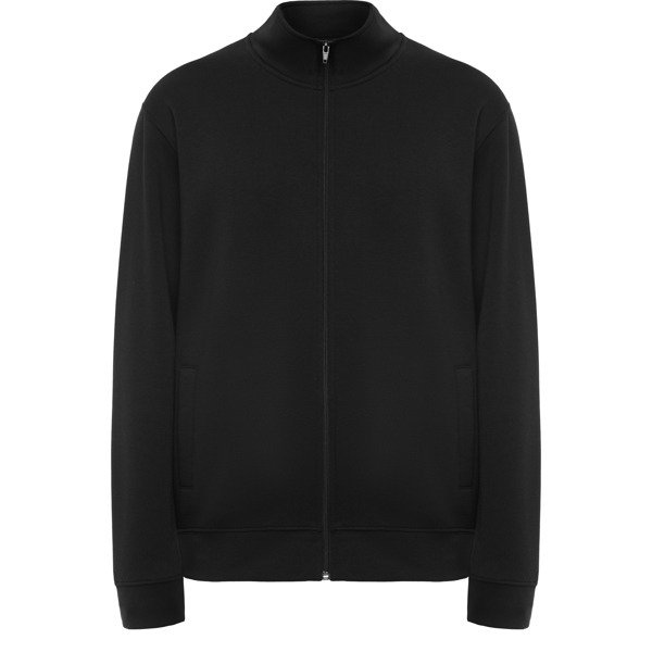 Sudadera unisex con cremallera frontal y cuello alto. Cremallera al tono. Dos bolsillos laterales con ribete del mismo tejido. Puños y cinturilla en canalé 2×1 con elastano. Cubrecosturas del mismo tejido.